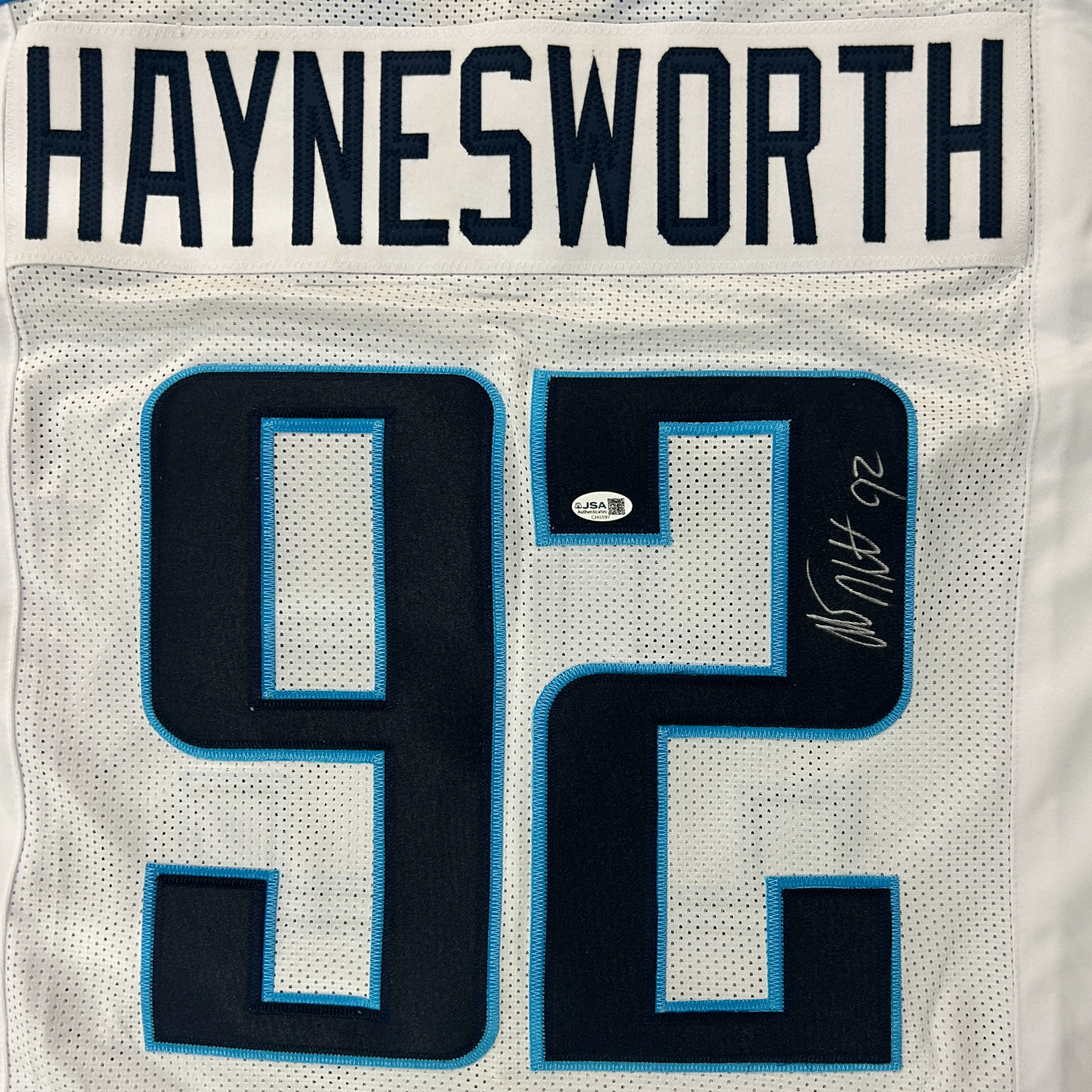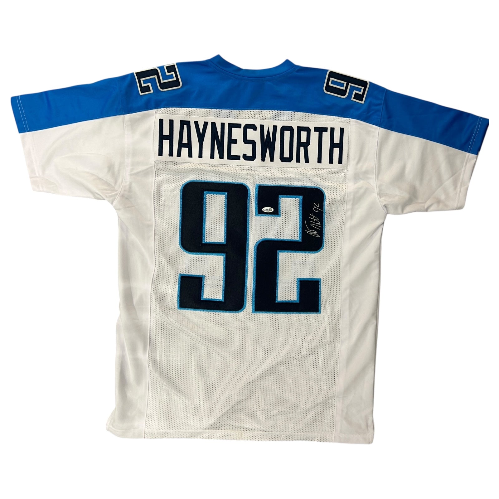 Own a piece of NFL history with this Albert Haynesworth autographed Tennessee custom jersey. Featuring the iconic #92, this premium collectible is authenticated by JSA, guaranteeing its legitimacy and value. Haynesworth's legendary defensive prowess is immortalized on this display-ready piece, perfect for serious collectors and passionate fans alike. A standout addition to any sports memorabilia collection that celebrates one of football's most dominant defensive tackles.
