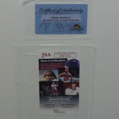 Unleash your inner detective with this Beverly Hills Cop deluxe framed movie poster, featuring the iconic Eddie Murphy autograph certified by JSA. Add a touch of Hollywood glamour to your home and relive the action-packed adventures of Axel Foley with this must-have collectible. Total frame dimensions are 34 x 44.