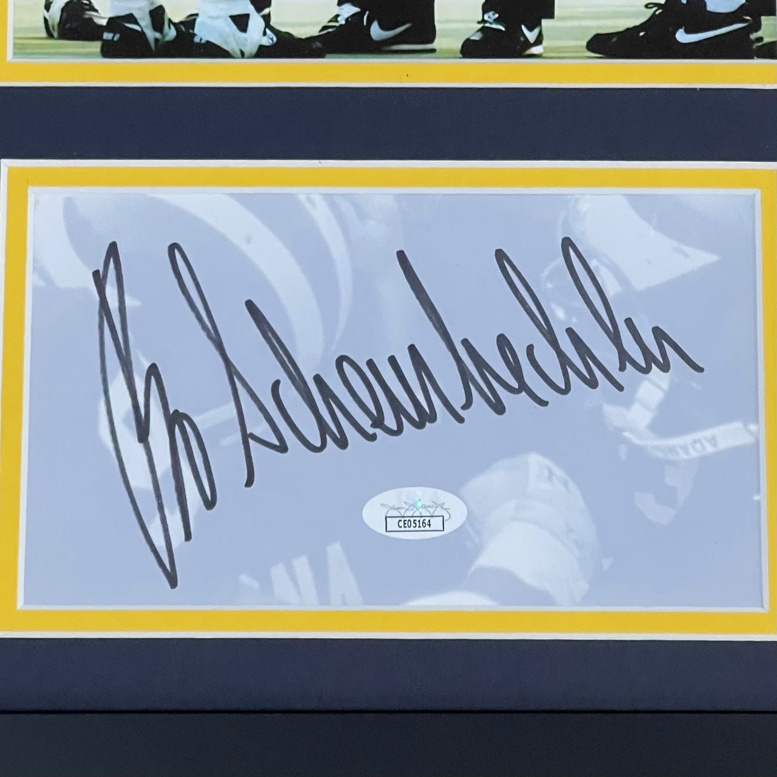 Celebrate the legacy of Michigan Wolverines with this deluxe framed tribute piece signed by the legendary coach Bo Schembechler himself. Authenticated by JSA, this piece is a must-have for any die-hard fan. Show your passion and pride for your team with this unique collectible.