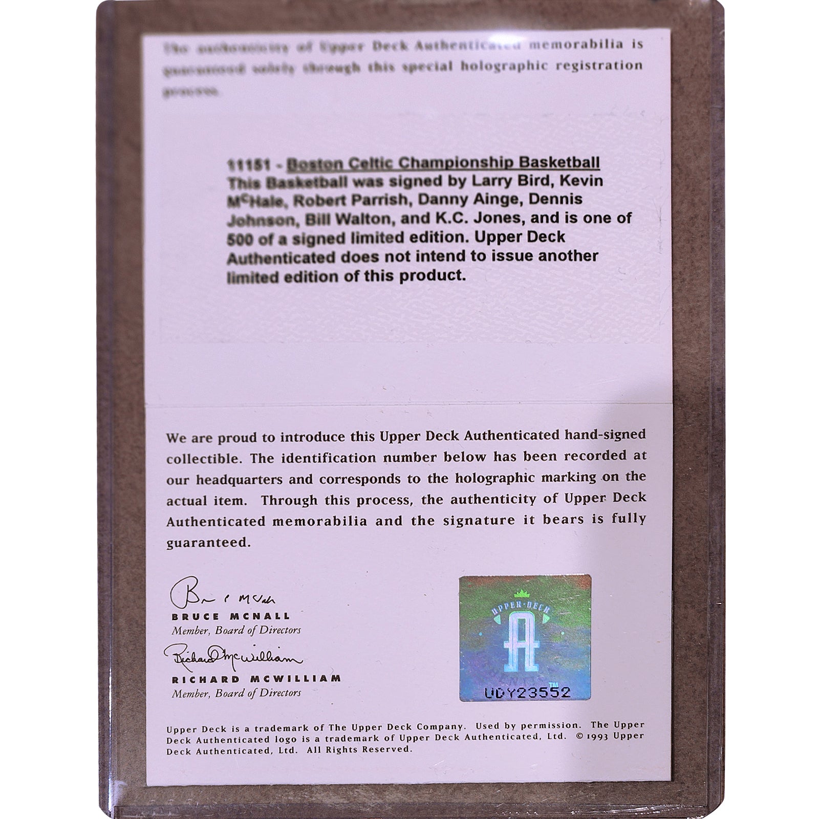 Signatures include: Larry Bird, Robert Parish, Kevin McHale, Danny Ainge, Dennis Johnson, Bill Walton, and K.C. Jones