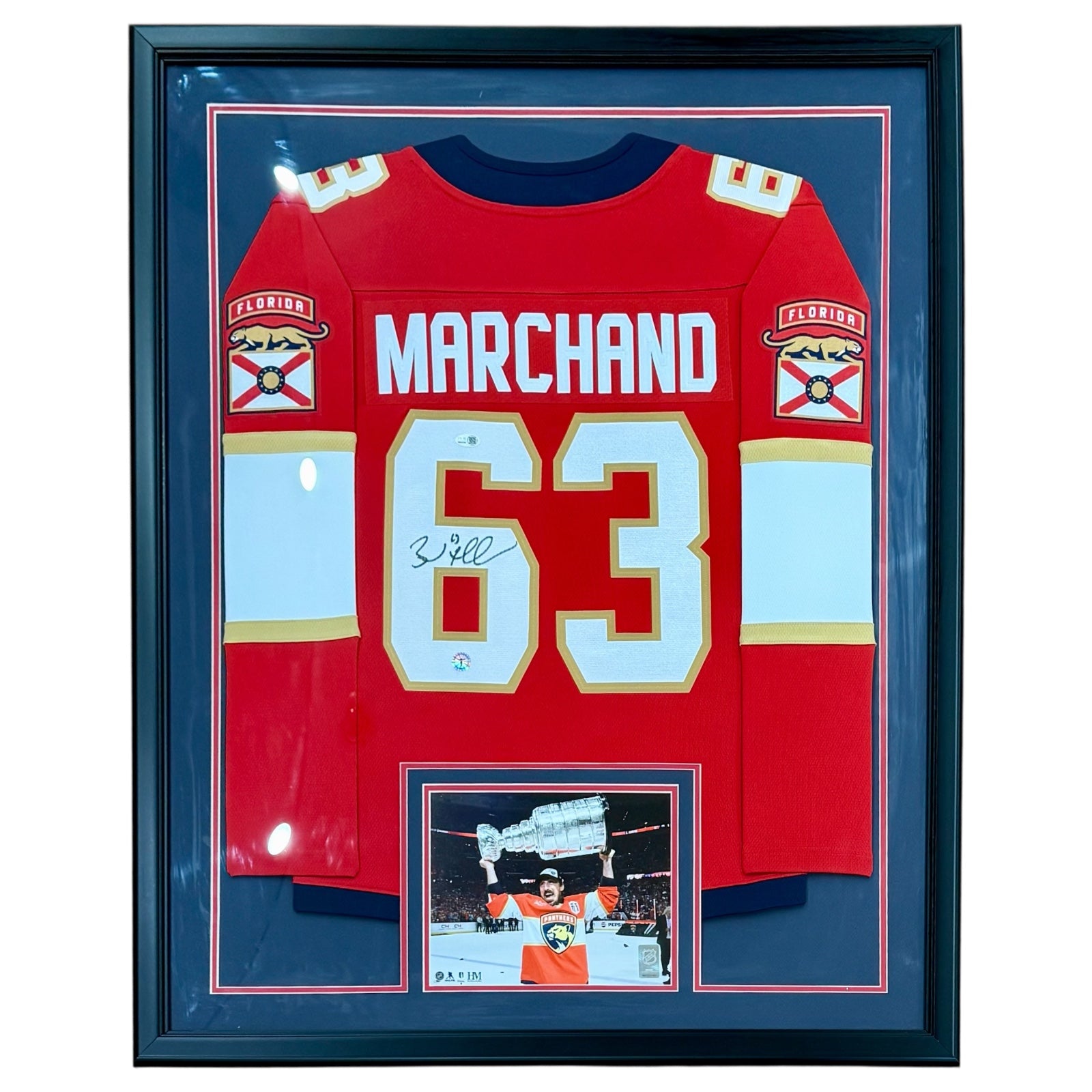 Experience the thrill of owning a piece of hockey history with this deluxe framed, autographed jersey of Florida Panthers star Brad Marchand. This authentic breakaway jersey is certified by JSA as well as the official Brad Marchand hologram, making it a valuable addition to any collection. Show off your team pride and support your favorite player with this special piece! Feel the excitement of owning a piece of hockey history with this deluxe framed, autographed Brad Marchand jersey. Proudly showcase your team pride and show your unwavering support for your favorite player with this unique and coveted piece!