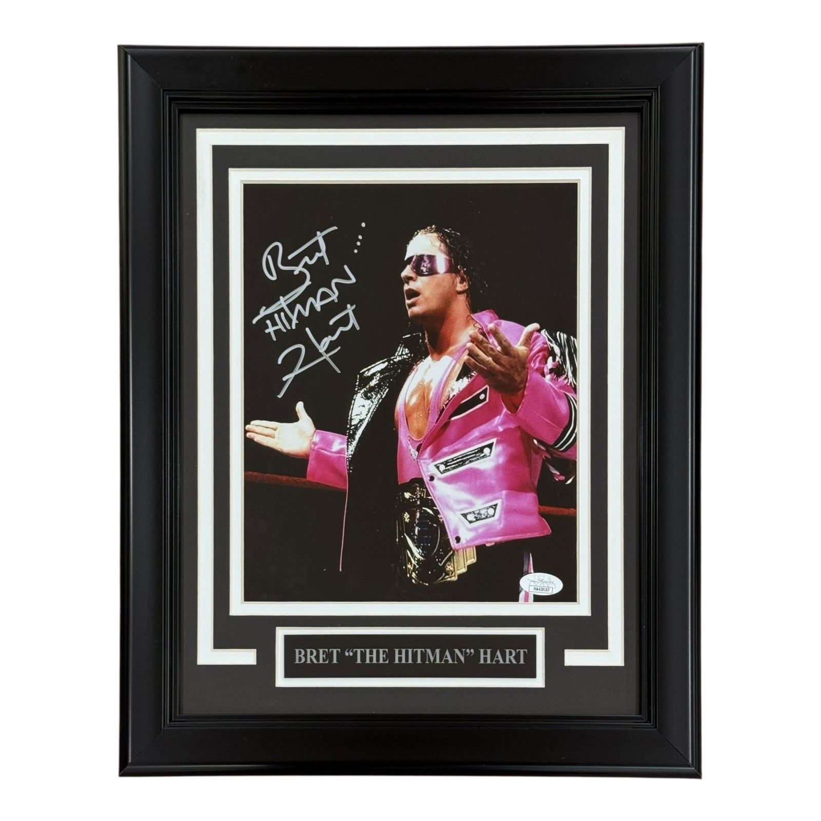 This 8x10 photograph was hand signed by Wrestler Bret Hitman Hart at a private signing. It is accompanied by a Certificate of Authenticity from JSA. It has been professionally framed and double matted. A tamper-evident hologram will be affixed to the item. Each signature is witnessed by a member of our staff or comes out of a private signing.