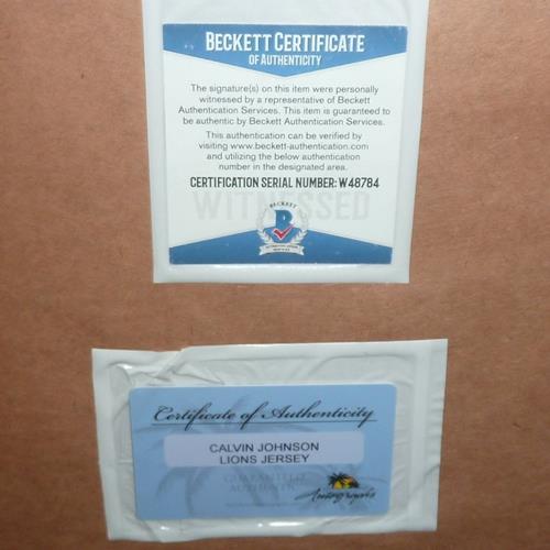 Embrace the legacy of an NFL legend with this Calvin Johnson Autographed Detroit Lions Deluxe Framed Jersey. Featuring a Beckett authentic autograph from the Hall of Famer himself, this White #81 jersey is a must-have for Lions fans. Elevate your collection and show off your team pride with this deluxe framed jersey. Each signature is witnessed by a member of our staff or comes out of a private signing.