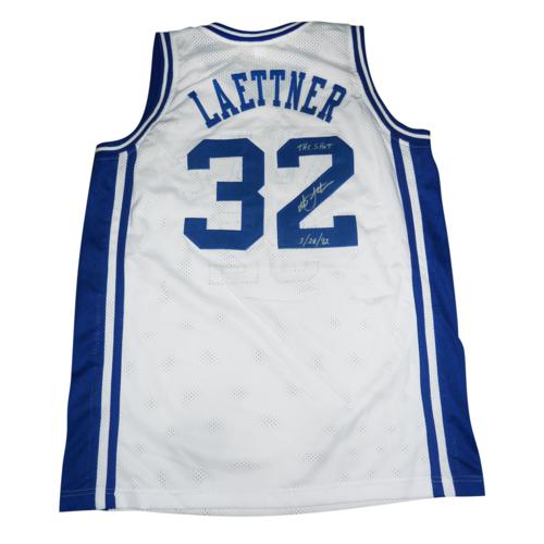 This unique Christian Laettner Autographed Duke Blue Devils jersey showcases "The Shot, 3/28/92" and a custom white #32 design. Display your passion for the legendary NCAA player with this authentic autographed jersey. Perfect for avid collectors and fans alike, this jersey is a must-have for any basketball enthusiast.