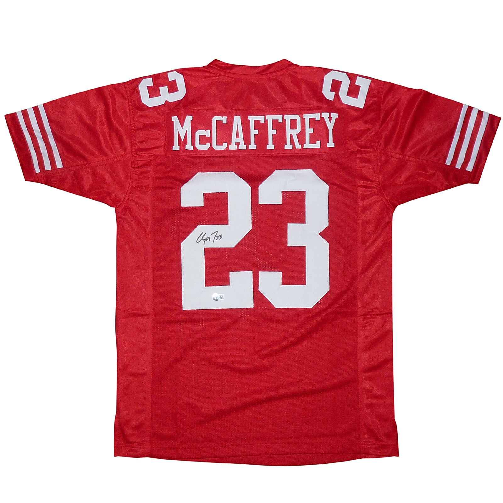 Elevate your sports memorabilia collection with this Christian McCaffrey autographed San Francisco Red #23 custom jersey, validated by Beckett. Show off your fandom with this unique piece signed by the star athlete, adding a touch of passion and excitement to any room. A must-have for any true fan!