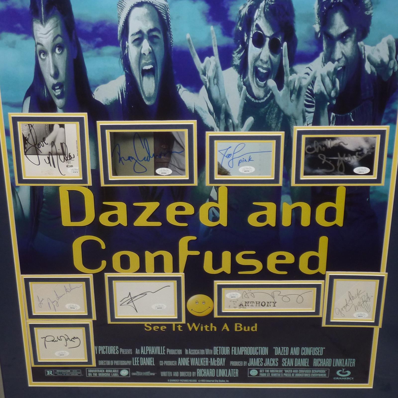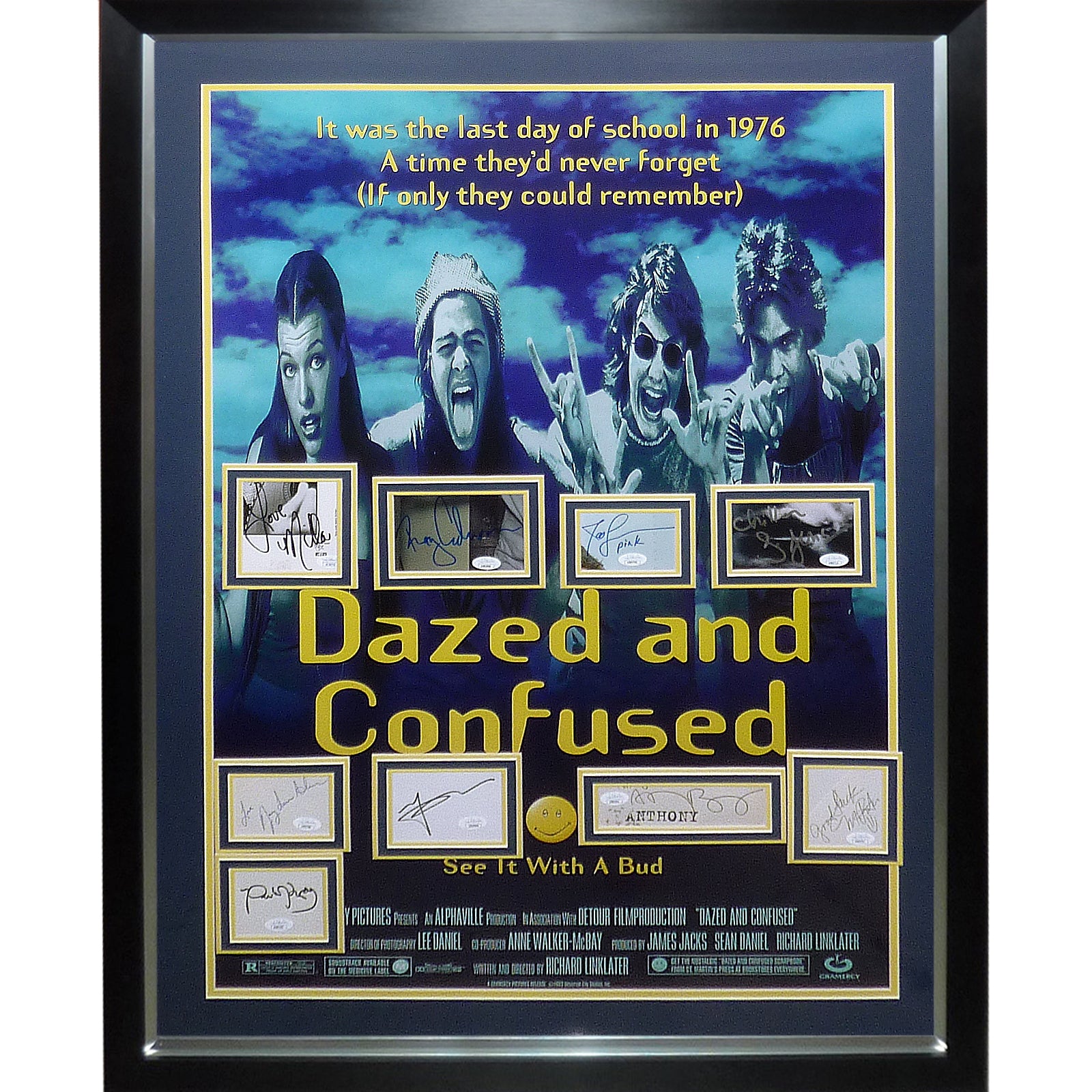 Experience the ultimate fan's dream with this deluxe framed Dazed and Confused movie poster, featuring all cast autographs authenticated by JSA! Perfect for any movie lover or collector, this stunning piece will bring the excitement and nostalgia of this iconic film into your home. Don't miss out on this unique opportunity! Total frame dimensions are 34x44.