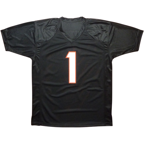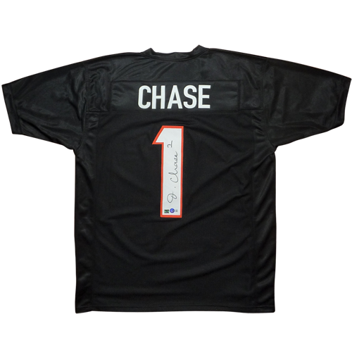 Stand out in this Ja'Marr Chase Autographed Cincinnati (Black #1) Custom Jersey! Featuring an authentic signature and Beckett authentication, this jersey showcases your support for the star player in style. Show off your team pride and own a piece of history with this one-of-a-kind jersey.