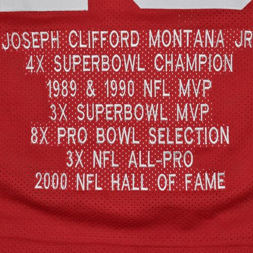 This stitched jersey was hand signed by San Francisco 49ers Hall of Famer Joe Montana at a private signing. It is accompanied by a Certificate of Authenticity from Palm Beach Autographs and JSA. A tamper-evident hologram will be affixed to the item. Each signature is witnessed by a member of our staff or comes out of a private signing.