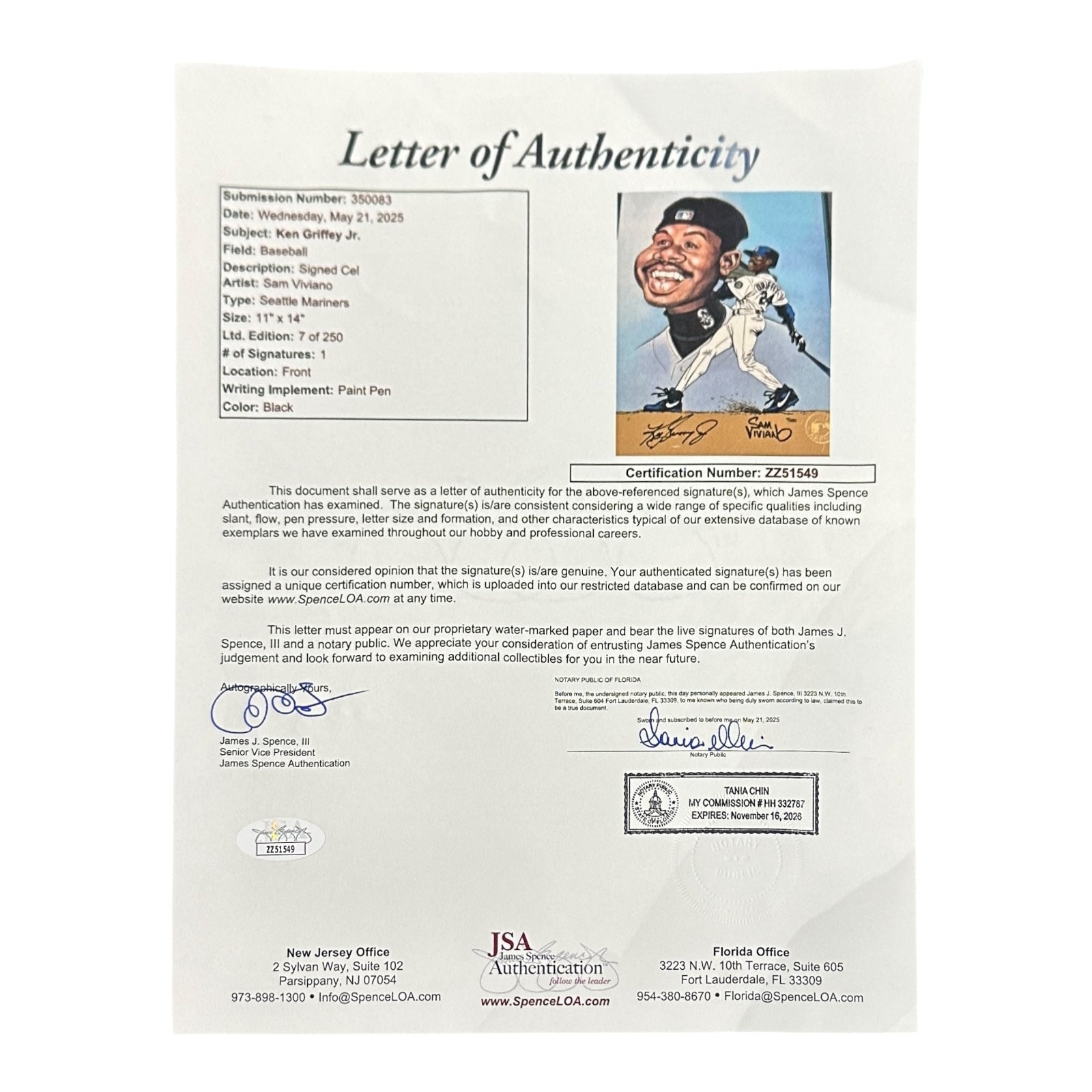 Enhance your collection with this Ken Griffey Jr. autographed 20x25 cello picture, elegantly framed and authenticated by JSA. This collectible offers a unique blend of style and authenticity, making it an exceptional tribute to a baseball icon. Perfect for fans who want to display their admiration with a striking and genuine piece.