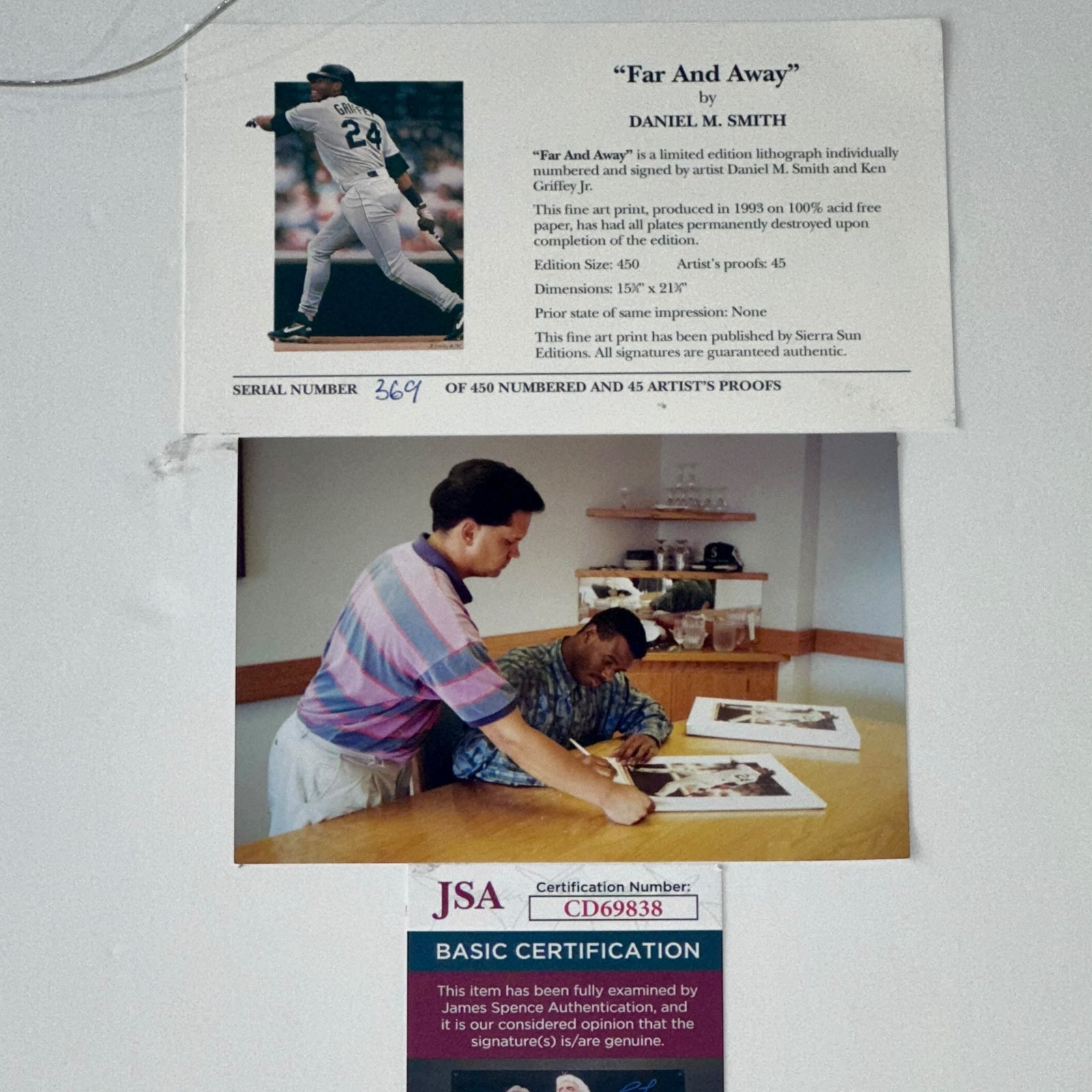 Celebrate a baseball legend with this Ken Griffey Jr. autographed 22x28 lithograph, professionally framed for display. Certified by JSA, this collectible combines authenticity with striking visual appeal, making it a must-have for any serious fan or collector. Showcase your passion for the game with a piece that honors one of baseball’s greatest icons.