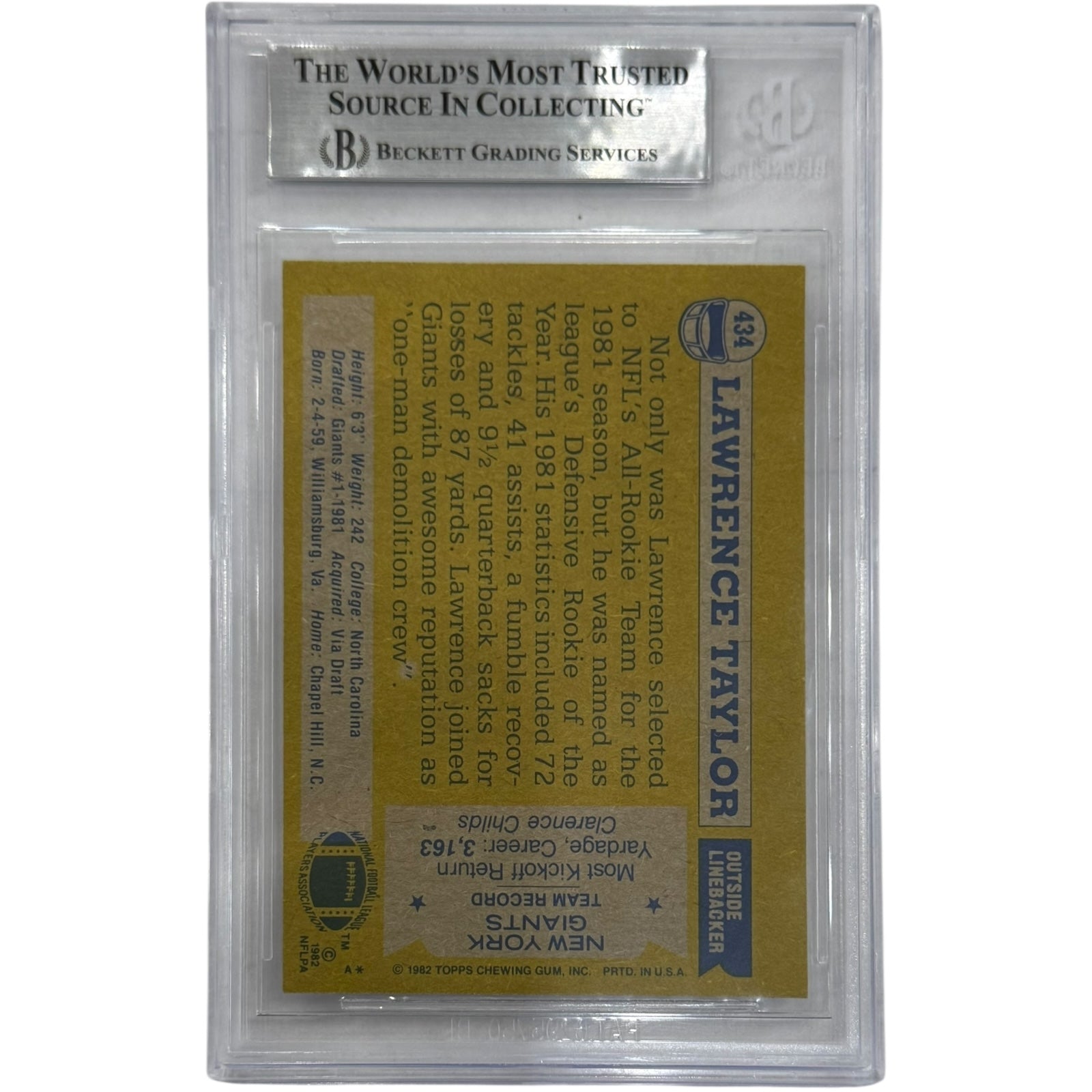 This Lawrence Taylor autographed 1982 Topps Rookie Card #434 is a must-have for serious collectors and Giants fans. Certified by Beckett, it combines iconic rookie status with authentic signature quality. Owning this card means holding a piece of football history, celebrating one of the greatest defensive players ever. Add lasting value and prestige to your collection with this rare, authenticated treasure.