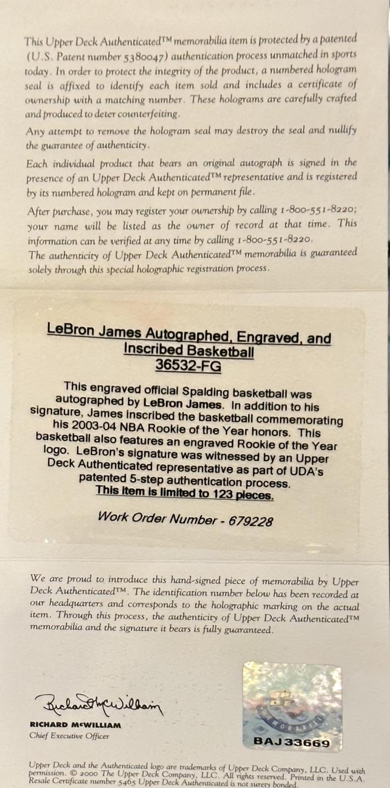 LeBron James Autographed NBA Rookie of the Year Embossed Spalding Basketball w/ ROY 04 Limited Edition #68 of 123 - UDA Upper Deck
