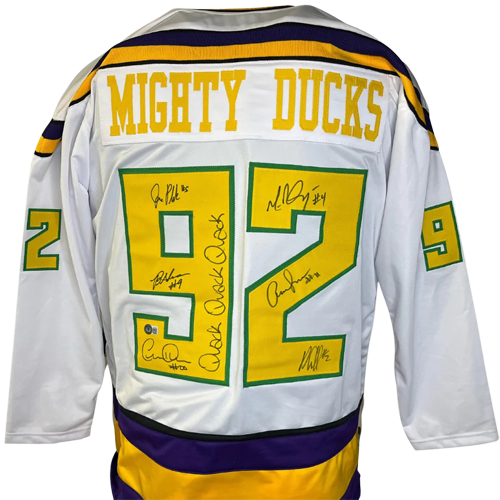 Mighty Ducks Cast Autographed (White #92) Custom Hockey Jersey w/ Quack Quack Quack - 6 Signatures - Beckett