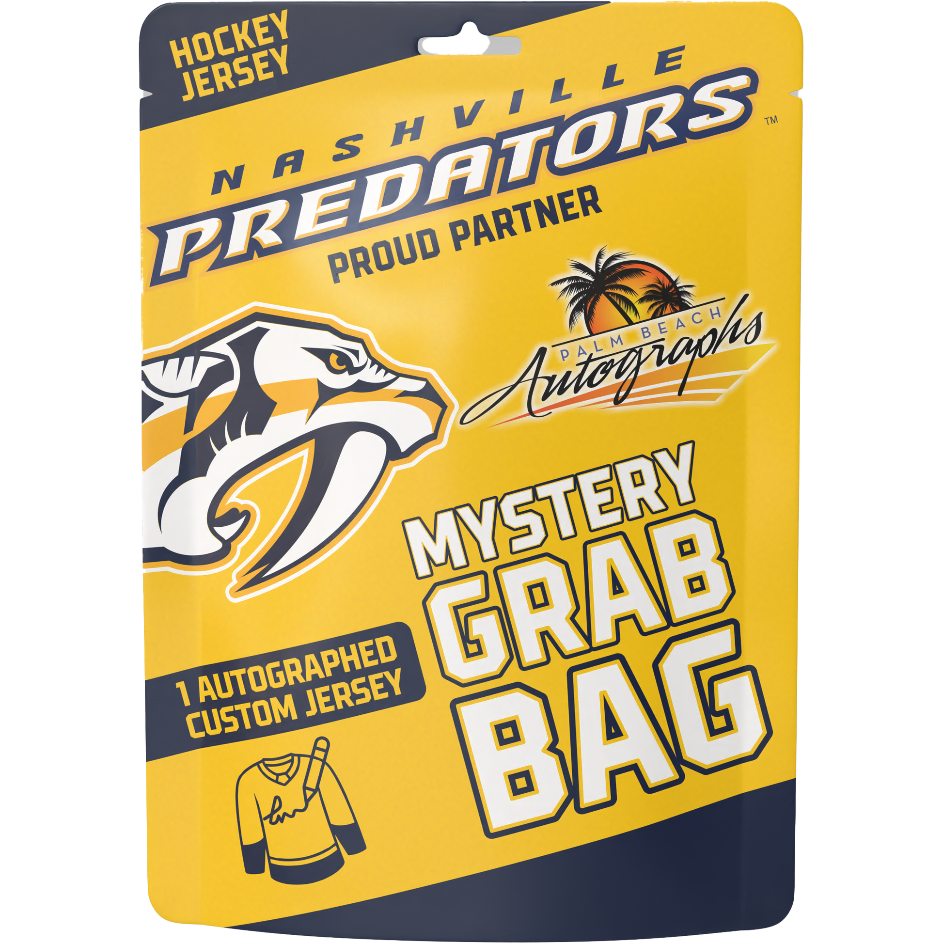 We introduced our "Mystery Grab Bag" program in our retail stores in 2012 and the response has been overwhelming. Due to popular demand, we are now offering these items online. Each Grab Bag is sealed and will contain one autographed custom stitched Jersey of a past or present Nashville Predators hockey player. It will be accompanied by a Palm Beach Autographs hologram and Certificate of Authenticity or a witness hologram from a major authentication company. For in-store purchases you will be able to select your own Grab bag, but for online purchases it will be selected at random by a member of our staff. No returns or exchanges on Grab Bags. Good luck!!