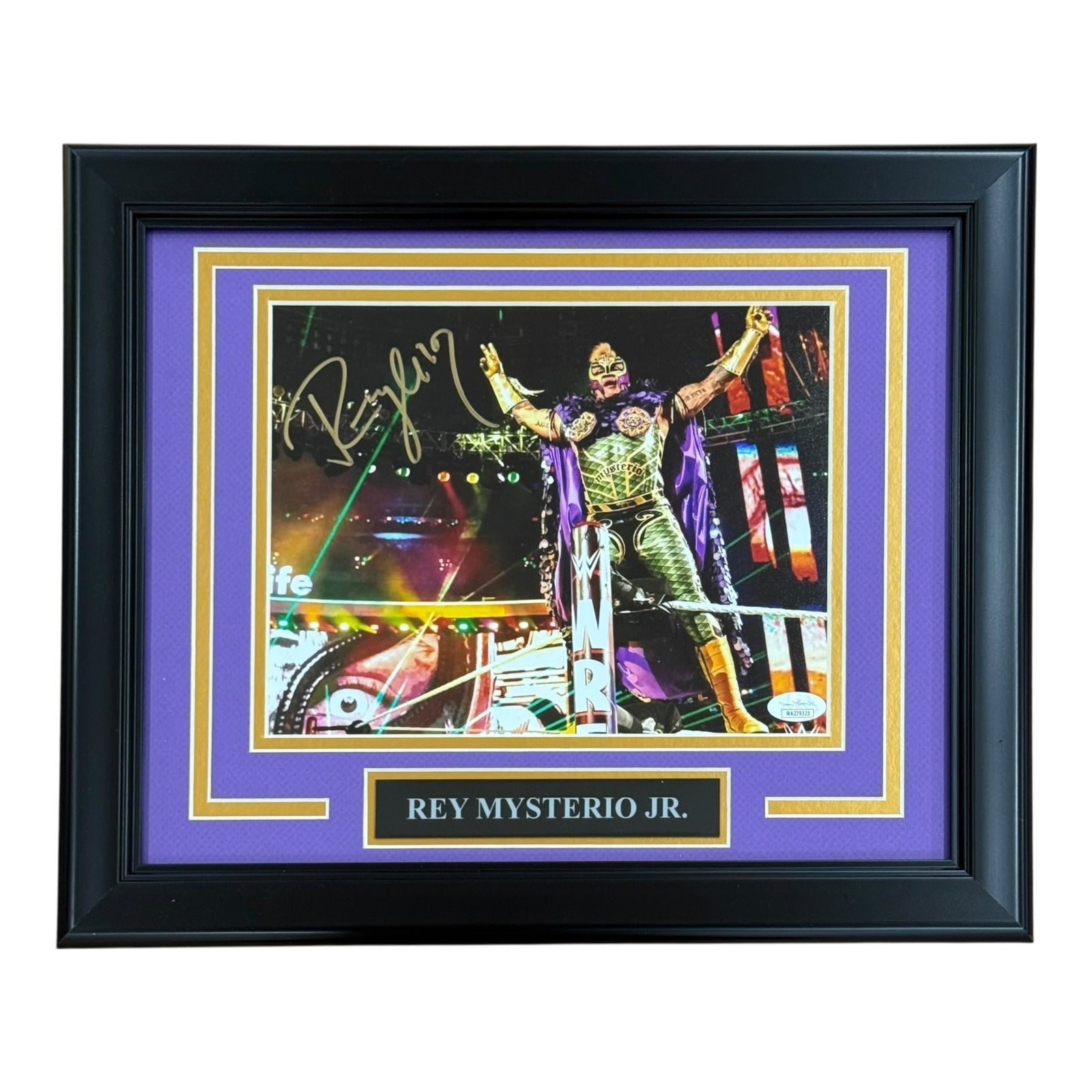 This 8x10 photograph was hand signed by Wrestler Rey Mysterio Jr. at a private signing. It is accompanied by a Certificate of Authenticity from JSA. It has been professionally framed and double matted. A tamper-evident hologram will be affixed to the item. Each signature is witnessed by a member of our staff or comes out of a private signing.