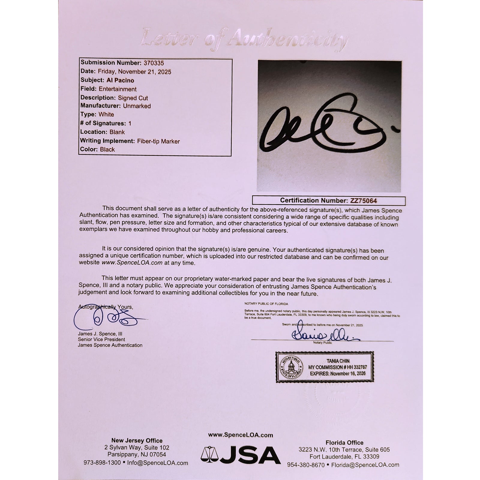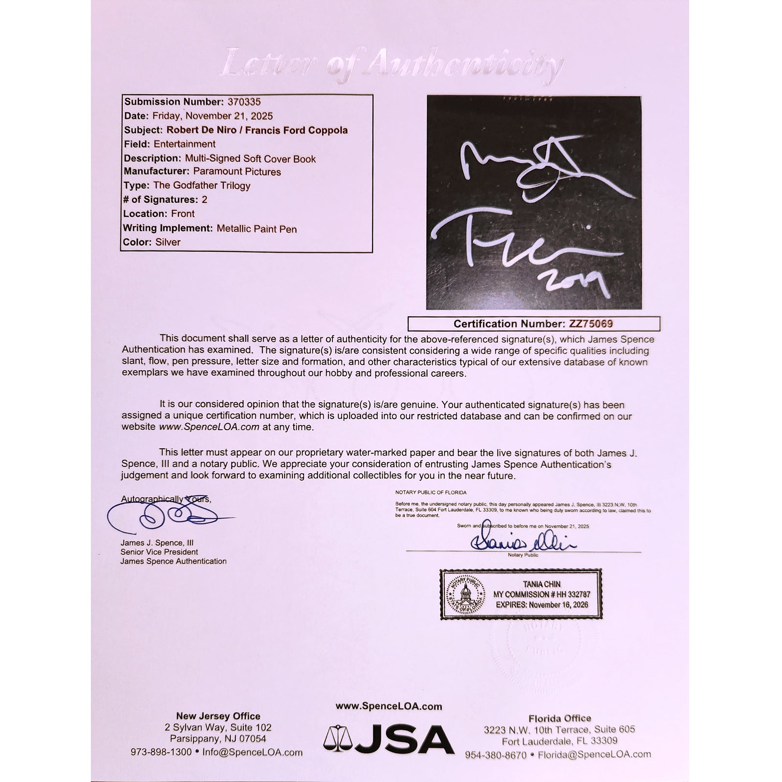 Display your love for the iconic film The Godfather with this deluxe framed movie poster featuring 6 authentic autographs.Β Signatures include Director Francis Ford Coppola And Actors Al Pacino (Michael), Robert Deniro (Vito Corleone) , Robert Duvall (Tom Hagen) , Diane Keaton (Kay Adams) And Talia Shire (Connie Corleone). Certified by JSA, this full-size poster is the perfect addition to any movie fan's collection. A must-have for any Godfather movie enthusiast! Total frame dimensions are 34x44.