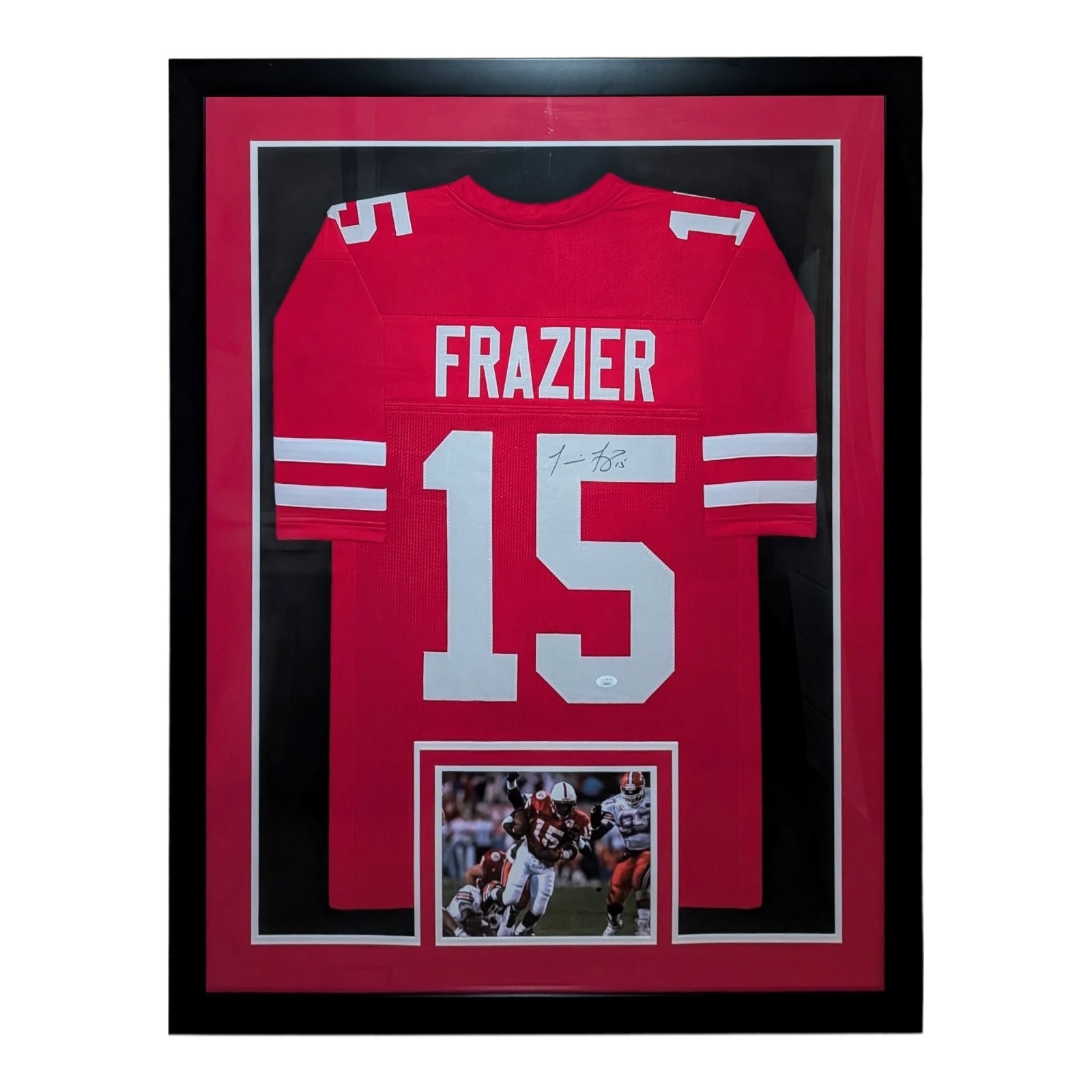 Celebrate college football history with this Tommie Frazier autographed Nebraska Huskers framed jersey. Featuring the iconic red #15 and commemorating the 1994-95 national championships, this collectible piece is a must-have for fans and memorabilia collectors. Professionally framed for display, it captures the spirit of a legendary era and adds a striking centerpiece to any sports collection or fan space.
